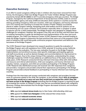 and staf encountered, as well as desired changes and recommendations for improvement to the Bridge Program Due to the unique timing of this evaluation, understanding the unique challenges caused by COVID-19 was added as an additional focus of the study Across both study years, CCRC Research conducted 223 key informant interviews (KIIs) with child welfare and resource and referral administrators, child care navigators, and trauma-informed care coaches, trainers, caregivers, and child care providers participating in the Bridge Program CCRC Research also distributed surveys and received over 950 responses from caregivers